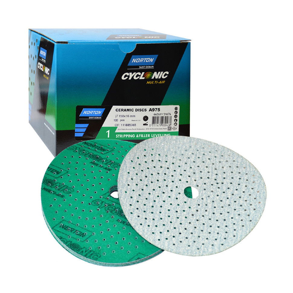 A Norton Cyclonic Multi-Air A975 a legújabb "minden egyben" csiszolási megoldásunk, amely a színes jelöléseknek (kódoknak) köszönhetően megkönnyíti a termék gyors és egyszerű kiválasztását a műhelyben. Szuperéles kerámia A975 szemcsékkel és No-Fil® technológiával készült a tökéletes csiszolási teljesítmény és a termék hosszabb élettartama érdekében. A kerámiaszemcsék hűvösebben vágnak, és egyenletesebben kopnak. Simítási alkalmazásokhoz a finomabb minőségű korongok vékony habszivacs hátlappal rendelkeznek, amely alkalmazkodik a felület kontúrjaihoz a sima, egyenletes felület érdekében. Az ultraprecíz lézeres vágási technológia laposabb korongot eredményez, növeli a csiszolófelületet és optimalizálja a porelszívást. Használja Multi-Air hátlappal a legjobb teljesítmény érdekében.