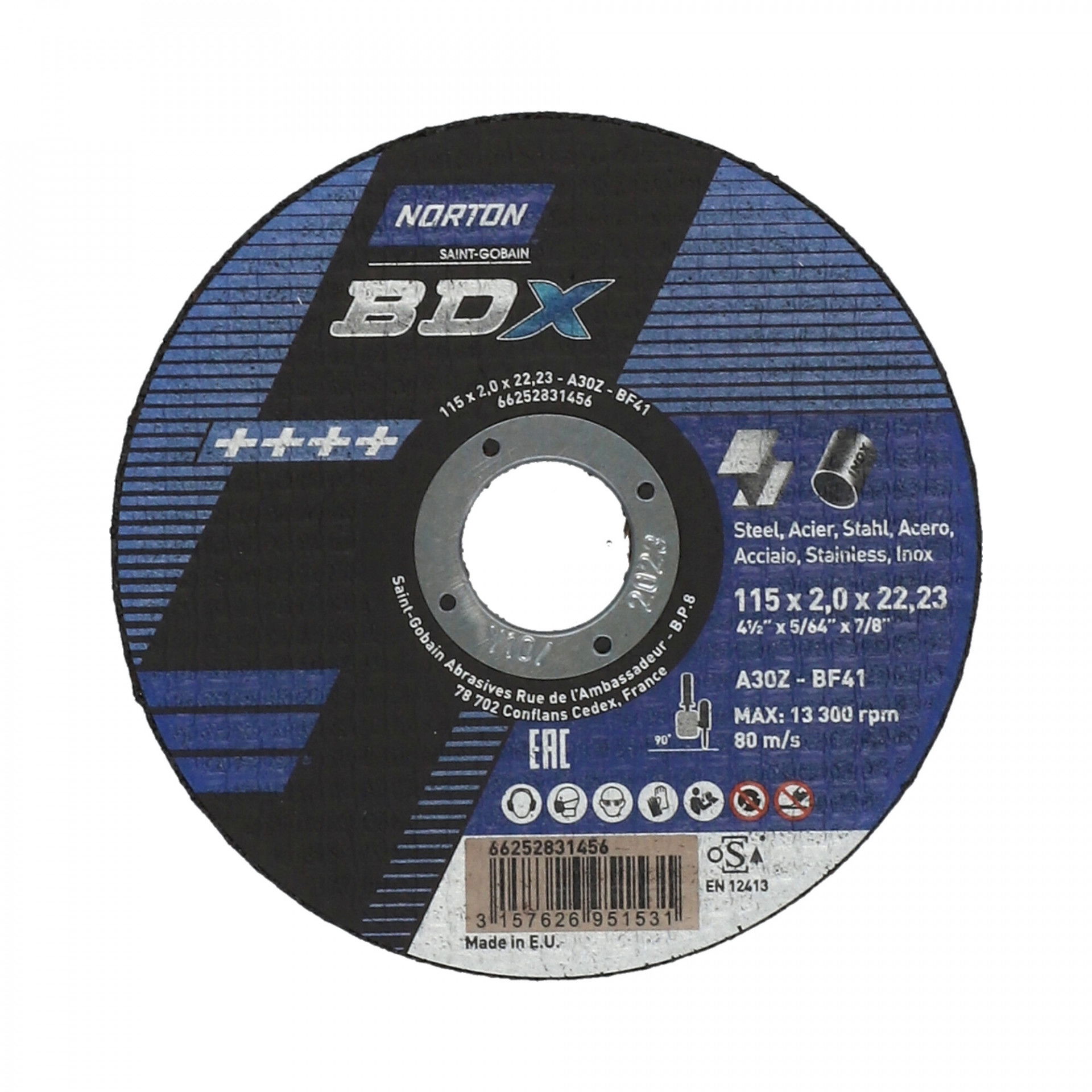 A Norton BDX fém-inox sorozat rendkívül vékony vágókorongokat kínál acél- és rozsdamentes acél széles választékához. A Norton BDX a költséghatékony vágókorongok szabványát állította be, amelyek hosszú élettartamot és gyorsabb fém eltávolítást biztosítanak az éles szilícium-karbid szemcséknek köszönhetően. Max.vágási sebesség : 80 m/s. Vas, kén és klór mentes. Nincs szennyeződés. Kevesebb rezgés.