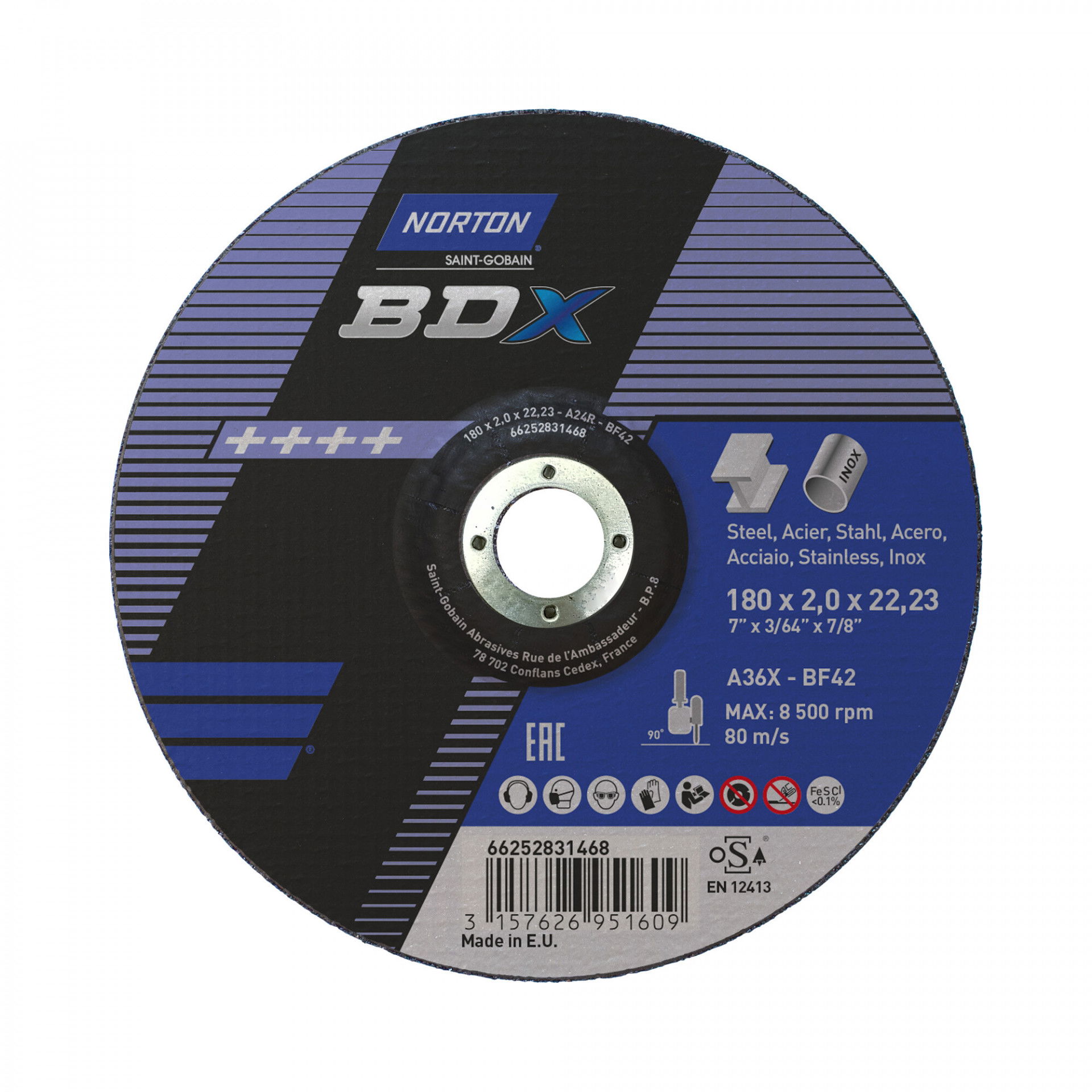 A Norton BDX fém-inox sorozat rendkívül vékony vágókorongokat kínál acél- és rozsdamentes acél széles választékához. A Norton BDX a költséghatékony vágókorongok szabványát állította be, amelyek hosszú élettartamot és gyorsabb fém eltávolítást biztosítanak az éles szilícium-karbid szemcséknek köszönhetően. Max.vágási sebesség : 80 m/s. Vas, kén és klór mentes. Nincs szennyeződés. Kevesebb rezgés.