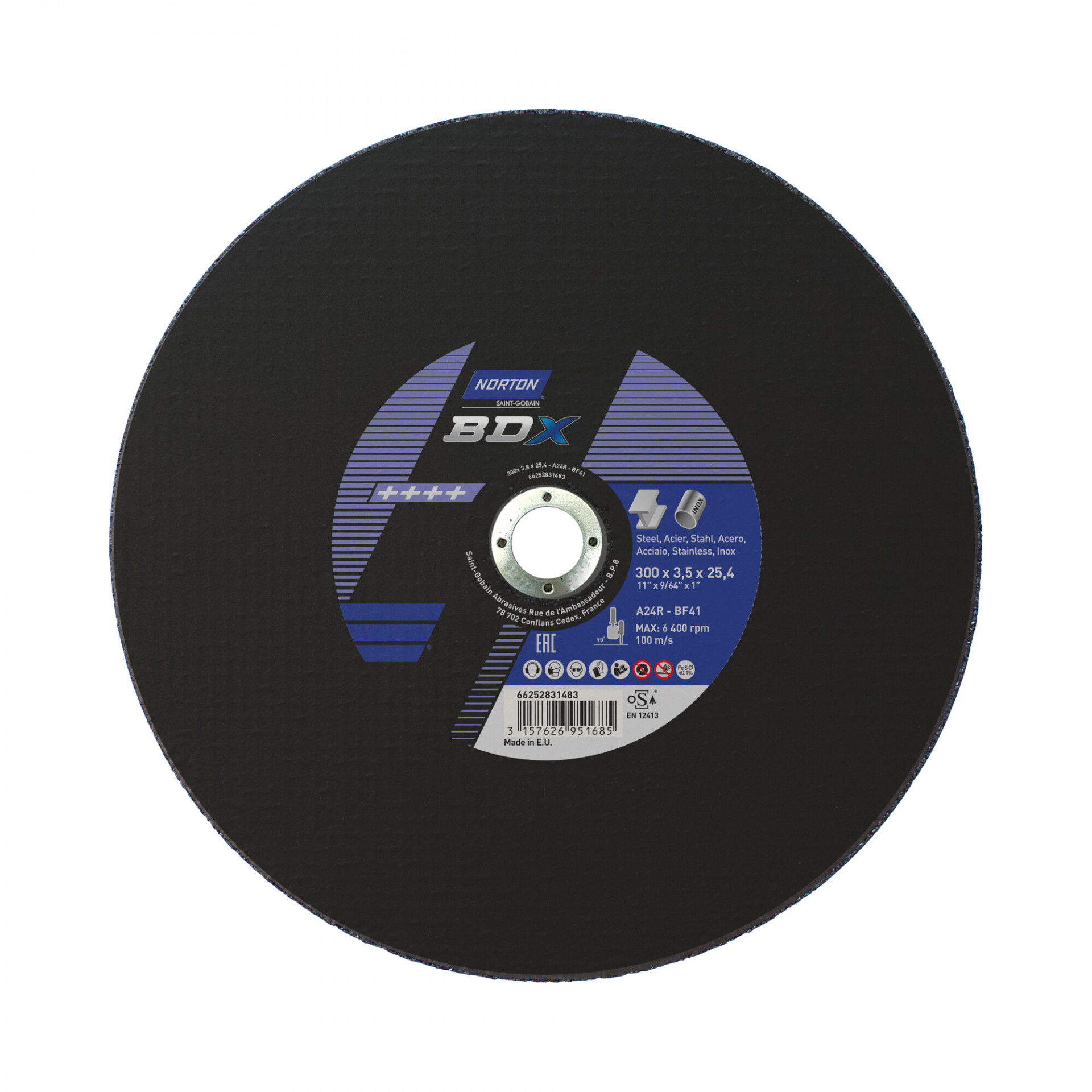 A Norton BDX fém-inox sorozat rendkívül vékony vágókorongokat kínál acél- és rozsdamentes acél széles választékához. A Norton BDX a költséghatékony vágókorongok szabványát állította be, amelyek hosszú élettartamot és gyorsabb fém eltávolítást biztosítanak az éles szilícium-karbid szemcséknek köszönhetően. Max.vágási sebesség : 80 m/s. Vas, kén és klór mentes. Nincs szennyeződés. Kevesebb rezgés. A vágókorongot kifejezetten kézi darabolókhoz tervezték.