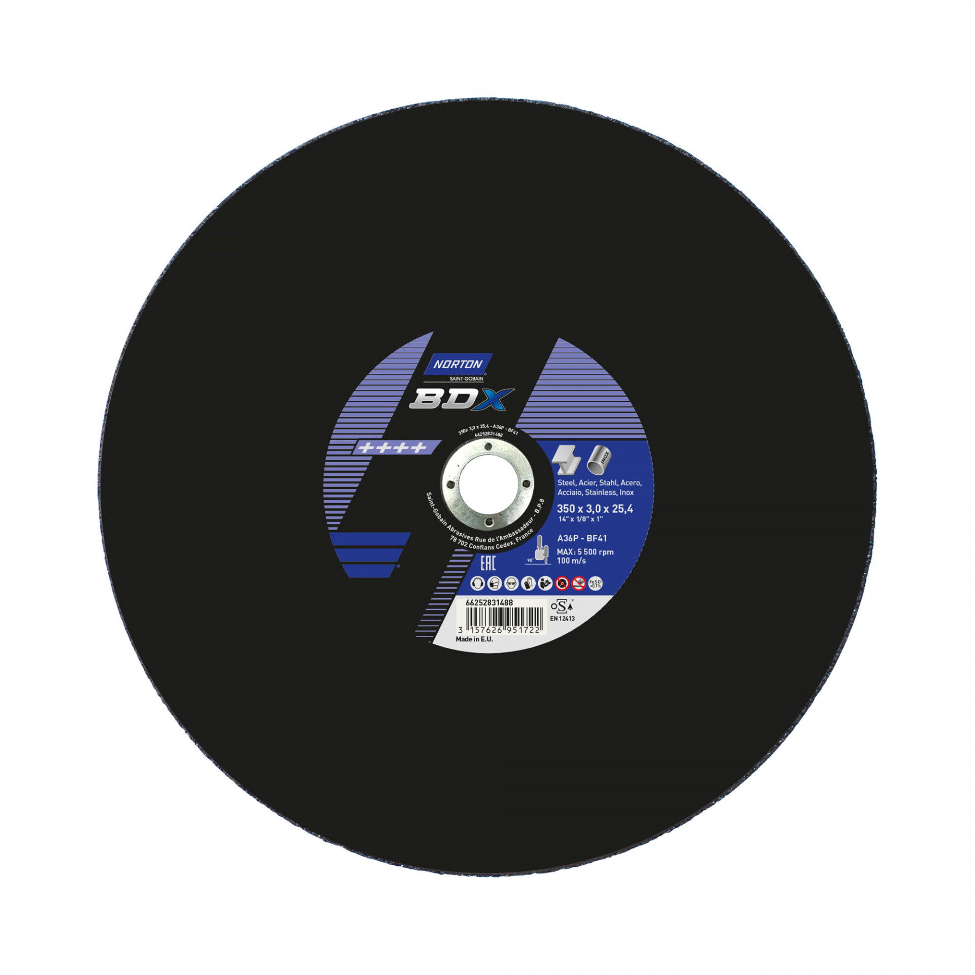 A Norton BDX fém-inox sorozat rendkívül vékony vágókorongokat kínál acél- és rozsdamentes acél széles választékához. A Norton BDX a költséghatékony vágókorongok szabványát állította be, amelyek hosszú élettartamot és gyorsabb fém eltávolítást biztosítanak az éles szilícium-karbid szemcséknek köszönhetően. Max.vágási sebesség : 80 m/s. Vas, kén és klór mentes. Nincs szennyeződés. Kevesebb rezgés. A vágókorongot kifejezetten kézi darabolókhoz tervezték.