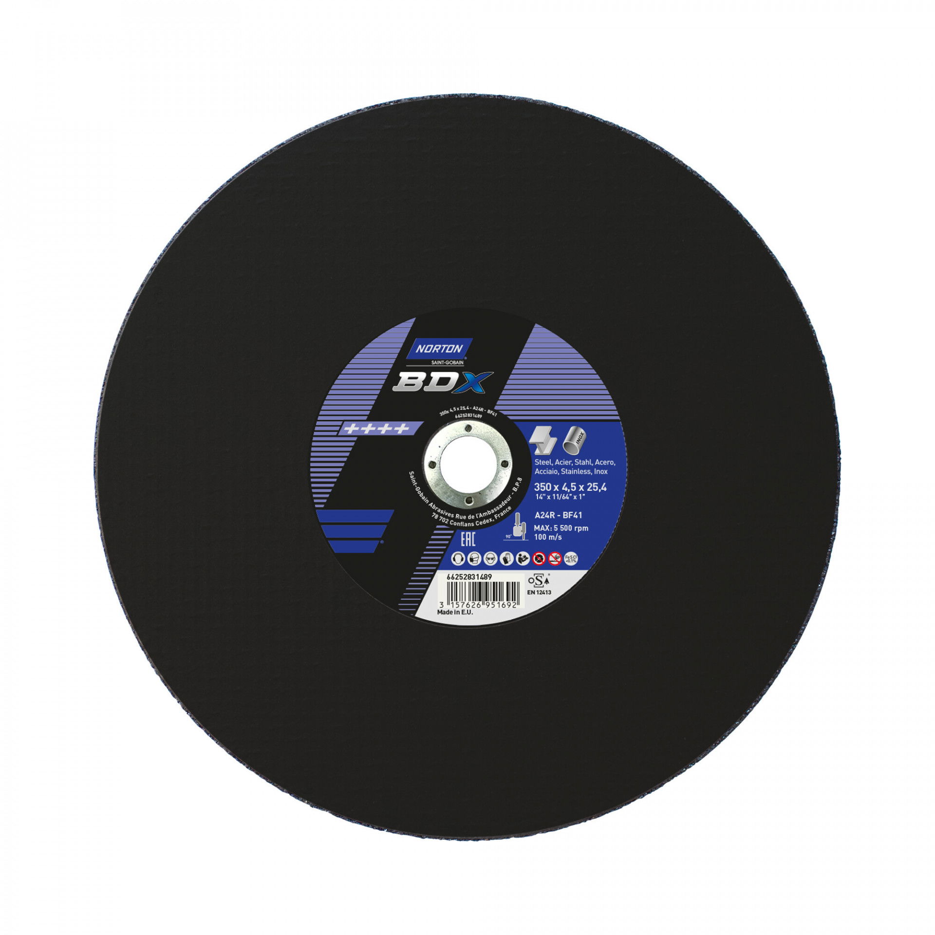 A Norton BDX fém-inox sorozat rendkívül vékony vágókorongokat kínál acél- és rozsdamentes acél széles választékához. A Norton BDX a költséghatékony vágókorongok szabványát állította be, amelyek hosszú élettartamot és gyorsabb fém eltávolítást biztosítanak az éles szilícium-karbid szemcséknek köszönhetően. Max.vágási sebesség : 80 m/s. Vas, kén és klór mentes. Nincs szennyeződés. Kevesebb rezgés. A vágókorongot kifejezetten kézi darabolókhoz tervezték.