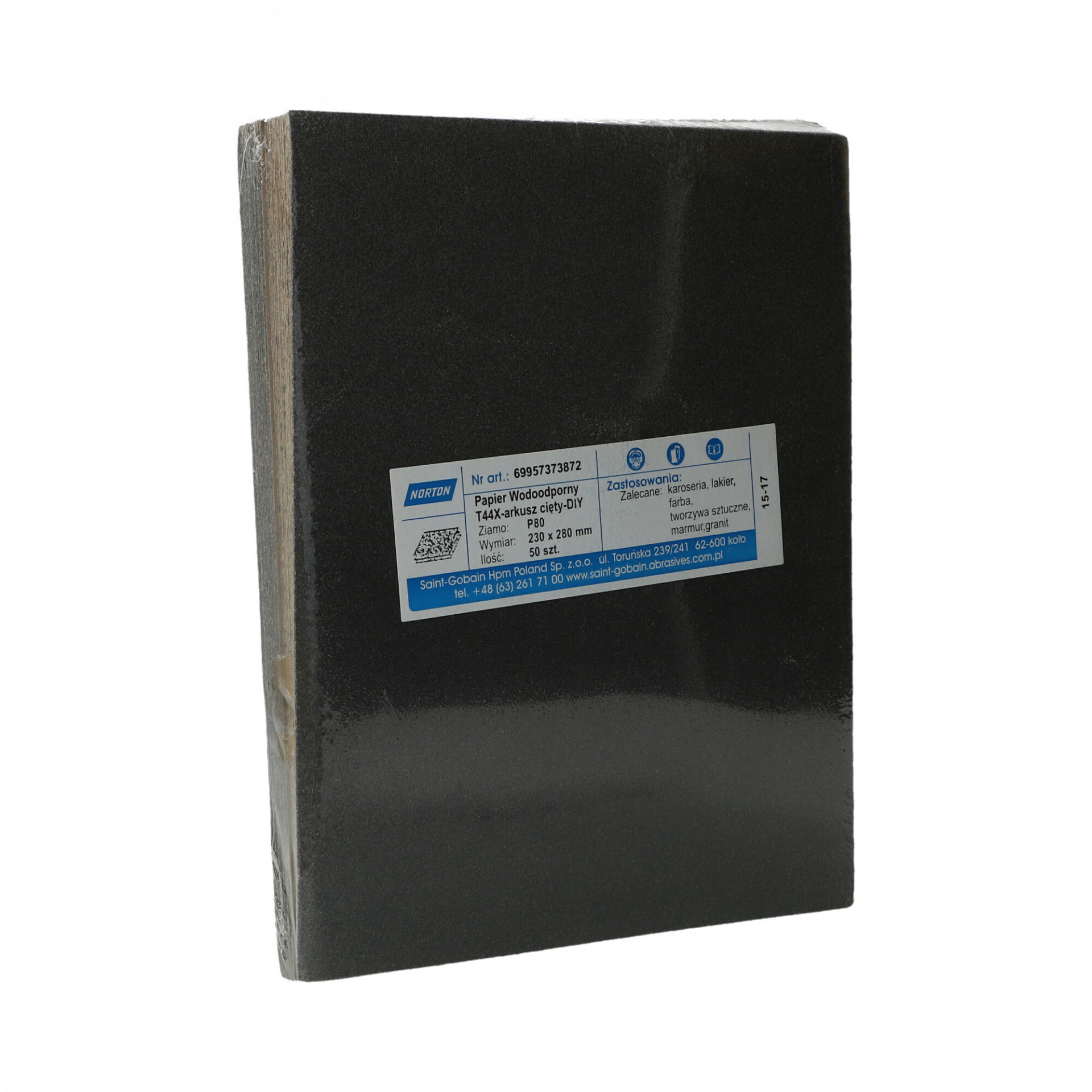 A Norton T44X vízálló csiszolópapír nagy teljesítményű szilíciumkarbid szemcsével nedves vagy száraz használatra alkalmas, nedves használat esetén tisztább felületet biztosít csiszolás közben. Gyors anyageltávolítás és simább és fényesebb felület elérése, ideális lakkozott felületeken való használatra és fémekhez. Festék- és lakkburkolatok, műanyagok, vas- és színesfémek csiszolására, polírozására is szolgál. Használható önmagában, csiszolótömbbel, kapcsos rögzítésű elektromos vagy akkumulátoros csiszológéppel.