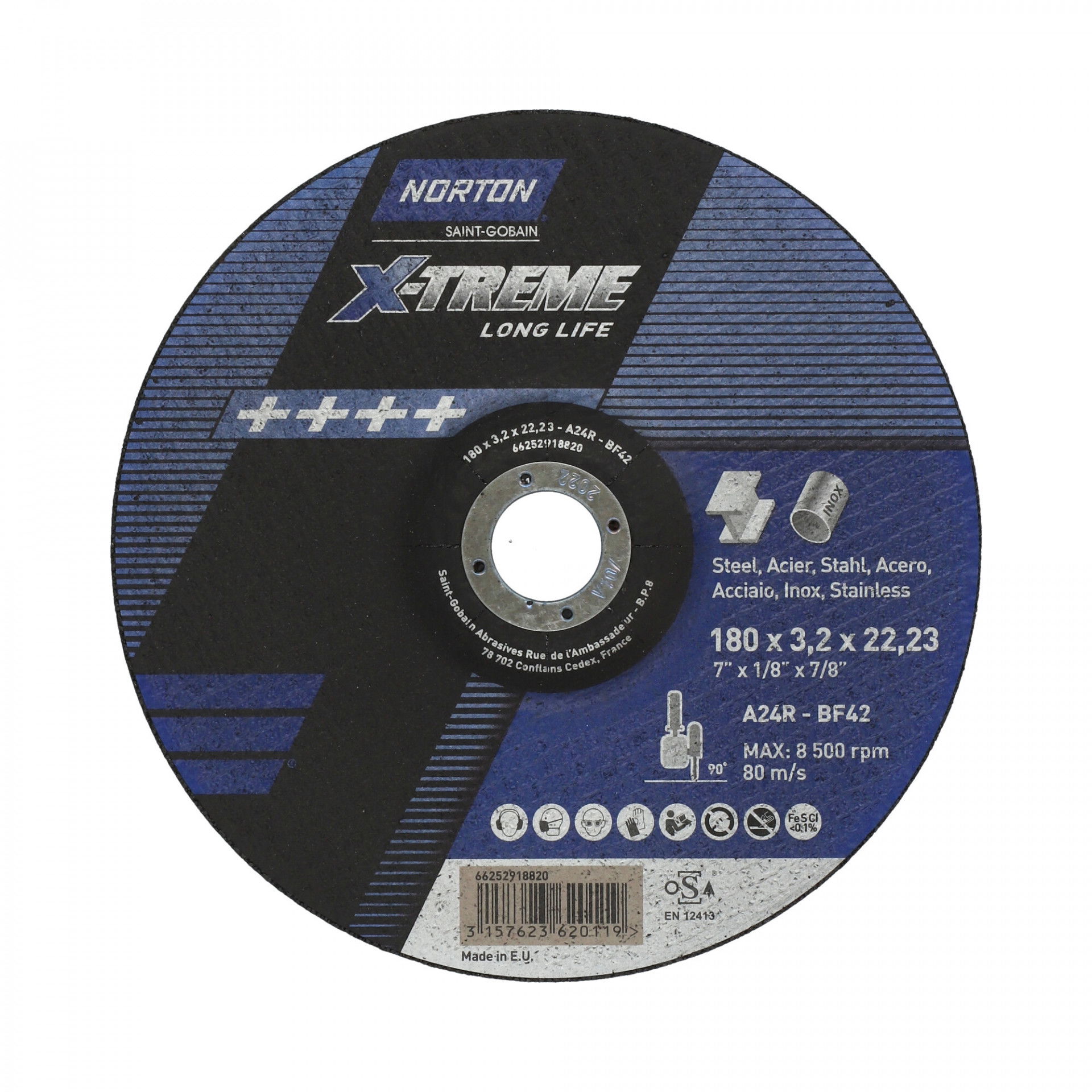 Nagy teljesítményű alumínium-oxid szemcsék a gyors és magas anyageltávolításhoz. A kiváló kötési rendszer hosszú ideig megtartja a szemcséket a korong élettartama alatt, ami kevesebb korongkopást eredményez. Ideális nehéz ipari felhasználásra minden kemény acéltípusokhoz és ötvözetekhez.
